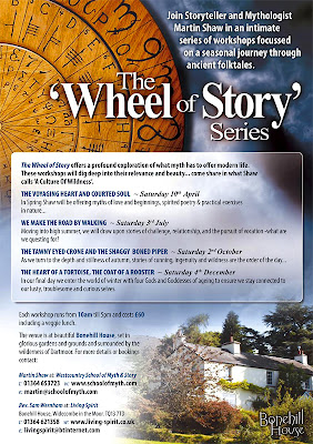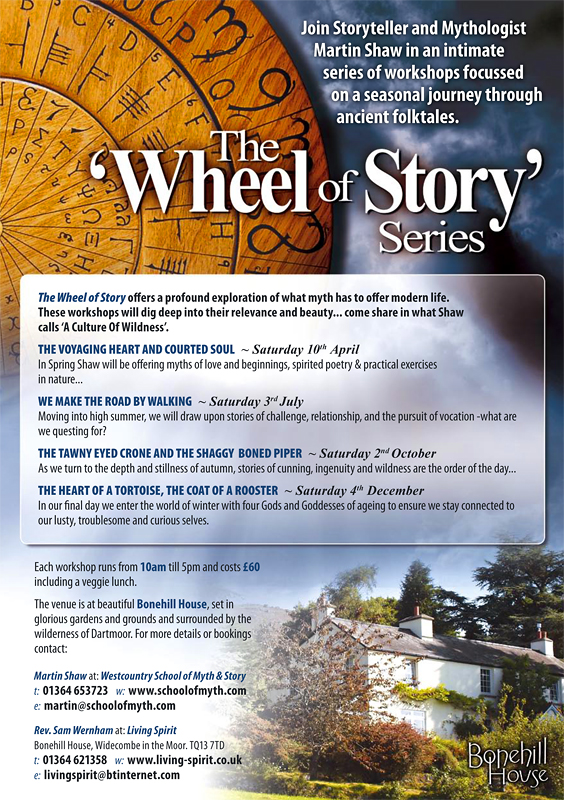 The Westcountry School of Myth and Story will soon be returning to Bonehill to start the ‘Wheel of Story’ rolling on Saturday April 10th. Award winning storyteller and mythologist Martin Shaw will be offering a rich feast of story, poetry and reflective, creative time outside on beautiful Dartmoor. Martin always has a wonderful way with words and he describes this first turn of the wheel as